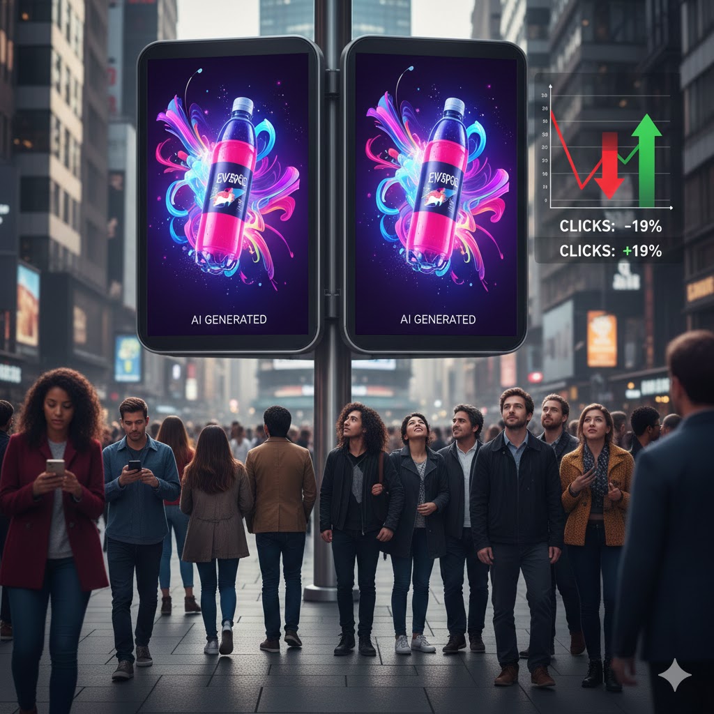 ๊ฐ์ฅ ๋๊ธธ์ ๋๋ ์ด์๋ ์์ฑํ AI ๊ด๊ณ ์ 'ํด๋ฆญ๋ฅ ๋๋ ๋ง'์ ๋๋ค. AI๊ฐ ๋ง๋ ๊ด๊ณ ๋ ์๊ฐ์ ์์ฑ๋๊ฐ ๋์ ํด๋ฆญ๋ฅ ์ 19%๐๋ ๋์ด์ฌ๋ ธ์ง๋ง, ๊ท์ ์ ๋ฐ๋ผ 'AI ์์ฑ' ๋ฌธ๊ตฌ๋ฅผ ํ๊ธฐํ์ ์ฑ๊ณผ๊ฐ ๋ฌด๋ ค 31%๋ ํ๋ฝํ์ต๋๋ค. ๊ธฐ์ ์ ์์ฑ๋๋ ์ธ๊ฐ์ ์์ง๋ ์ผ๋, ์๋น์๋ค์ '์ฌ๋ฆฌ์ ๊ฑฐ๋ถ๊ฐ'์ด๋ผ๋ ์ฅ๋ฒฝ์ ์ด๋ป๊ฒ ๋์์ง๊ฐ ๋ง์ผํฐ๋ค์ ์ต๋ ๊ณผ์ ๊ฐ ๋์์ต๋๋ค.